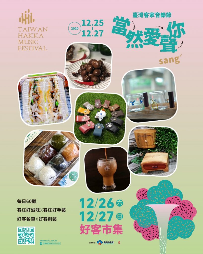 今年首次結合客庄特色市集,網羅全臺各地客家工藝、客家道地美食攤商,與融合客家元素的創意料理餐車進駐,除了有來自客庄的菜包、手工粢粑、黑糖牛汶水等,及運用客家食材研發具有客家滋味的創意料理,例如:炒板條肉醬堡、Hakka酸菜炆爌肉堡、麵茶雞蛋仔。來自客庄的創意手作攤位,包括客家花布文創商品、精緻玻璃工藝等,許多攤商也提供DIY課程,大小朋友可現場製作屬於自己的客家小物。多達60攤好客市集,讓民眾享受音樂的同時,也能一同在豐富的市集攤商中認識客家藝術文化,輕鬆享受客庄好滋味。
