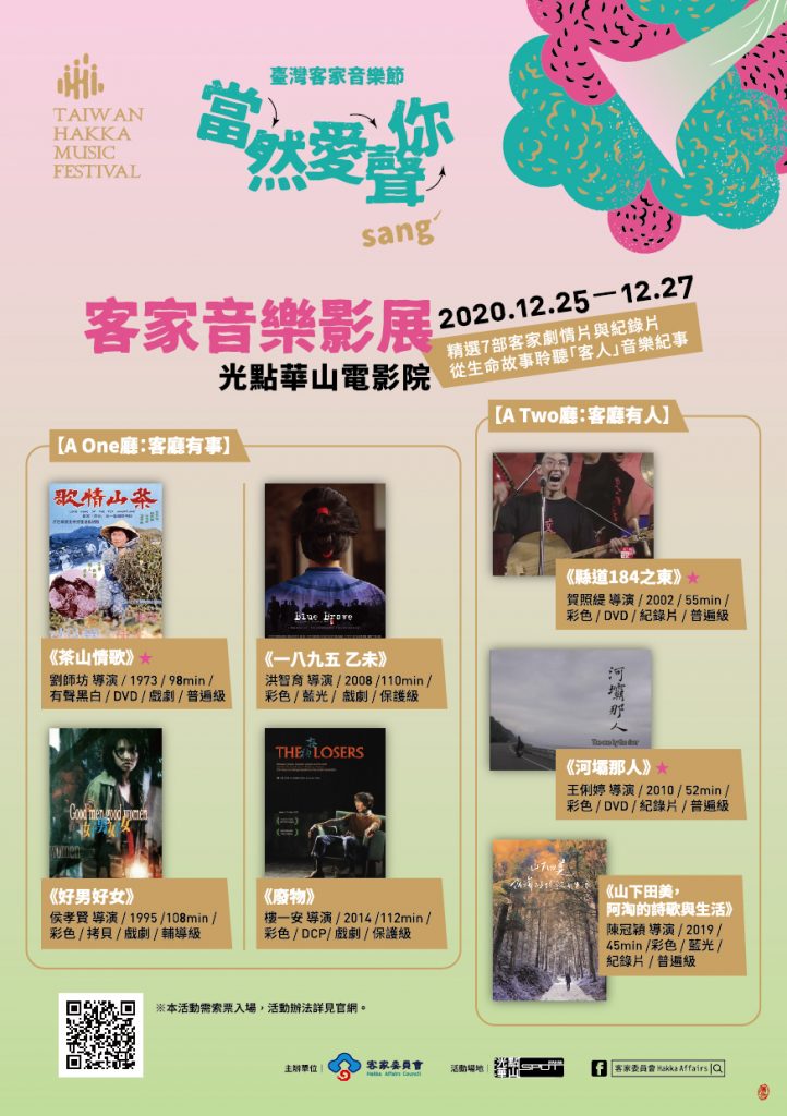 首次舉辦的客家音樂影展中,精選7部客家經典劇情片及紀錄片,從重要傳統藝術客家山歌保存者—賴碧霞之經典演出《茶山情歌》,到現代流行客家音樂人米莎、林生祥、陳永淘等人之真實紀錄片,也特別選映今年甫獲頒金馬獎「終身成就獎」之侯孝賢導演,享譽國際經典名作,並由顏志文老師擔任電影配樂的「臺灣三部曲之《好男好女》」。