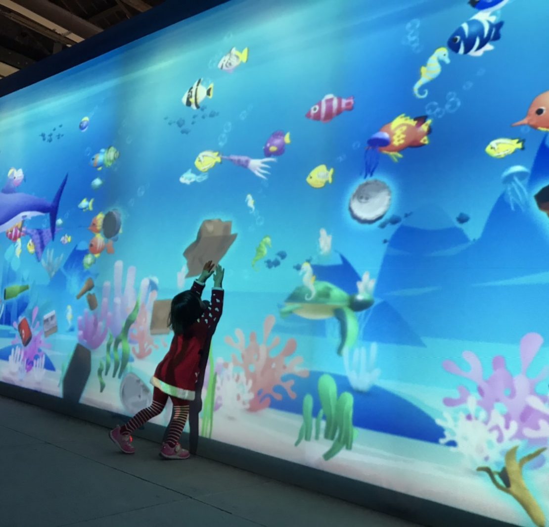 只要輕拍投影牆,就能清除垃圾!不過,要小心不能打到魚唷!