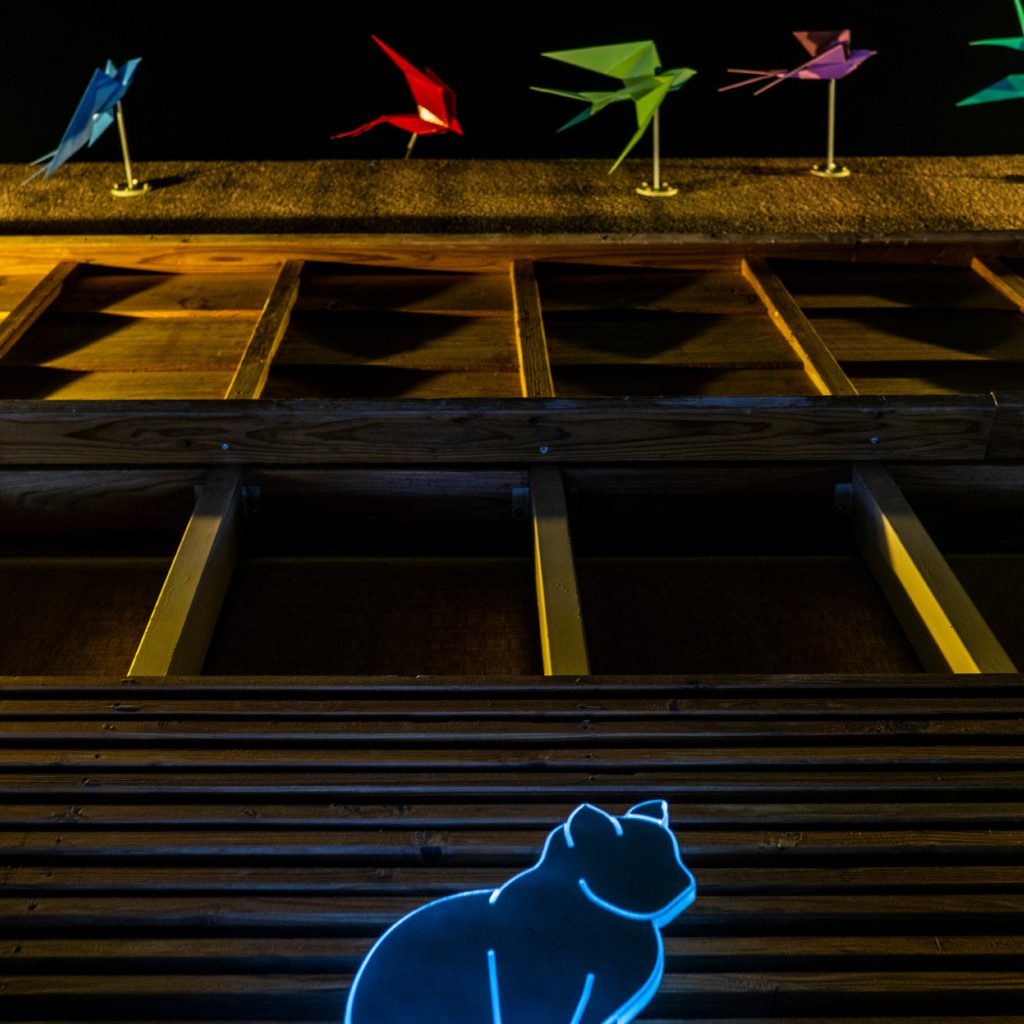 作品轉化貓與燕子的意象來呼應鹽水迷人的風土民情,並以繽紛的色彩與造型創造出活力的場景。高飛的彩燕象徵期望與關愛,希冀鹽水能有更多向上的年輕力量綻放;齊聚的貓咪象徵多元與團結,希冀鹽水能有更多不同的面貌與發展。地方的轉變是進行式,而鹽水正在進行中,貓咪知道,燕子也想像得到,你呢?