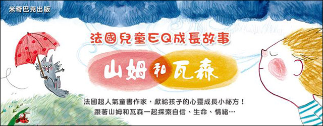 因此,吉斯蘭創造了【山姆和瓦森】,透過一系列發生在兩個可愛的主角身邊的生活故事,和幼兒一起探索自信、生命、情緒。這套書最重要的設計,在於它透過一個深具同理心的貓咪(而不是大人),陪伴山姆理解、認識生活中遭遇的種種問題。
