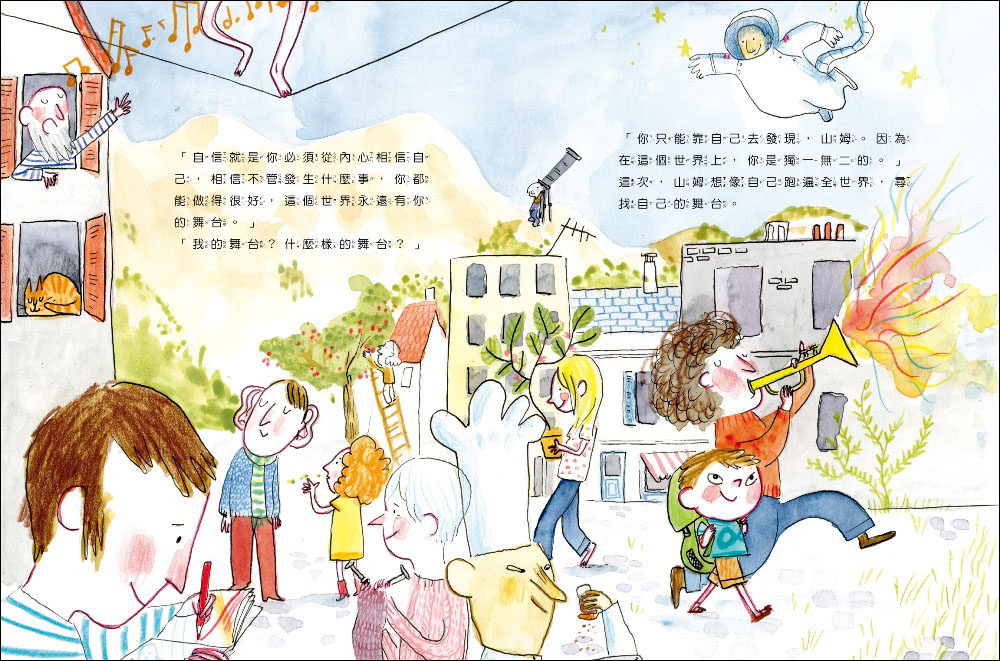 這次,山姆想像自己跑遍全世界,尋找自己的舞台。