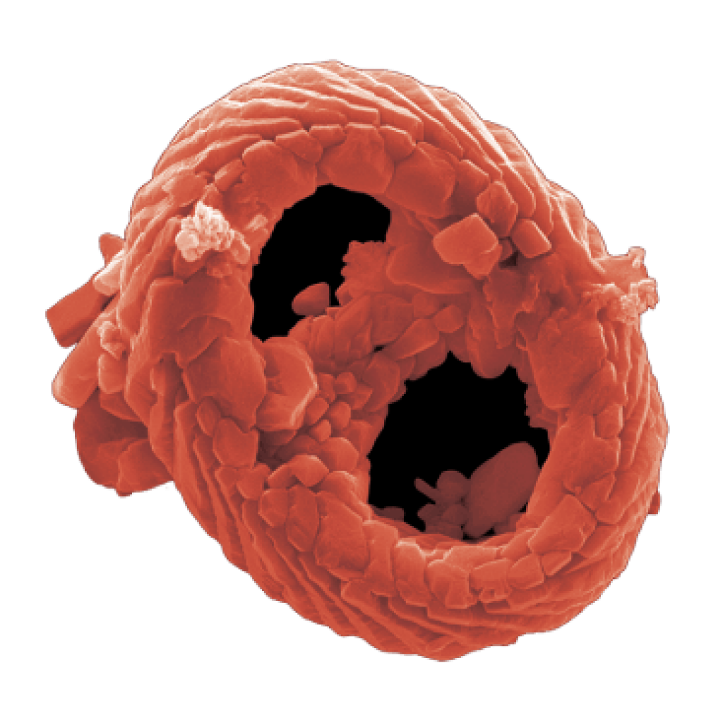 鈣板藻是單細胞原生生物,與矽藻同為大洋浮游植物之重要成員。碳酸鈣質的鈣板於細胞內形成後,次第向外擠出,在細胞周圍形成重重保護的盾甲。鈣板數量隨屬種而有差異,形狀亦個個不同,通常有數片至數十片,當有鈣板覆蓋時又可稱為鈣板球。