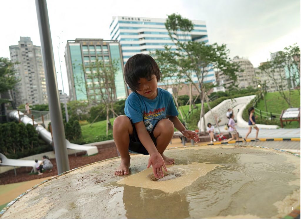 耗時兩年,這塊遊戲空間在 2019 年暑假前夕開 放與城市孩子相見時,全台的兒童遊戲空間已 有顯著的變化,但也因為兩年的規劃期,處處可見這座遊戲空間在設計建造間的細節考量。 「水沙世界」的設計,是最能代表「參與式設計」 和「工作坊成果」的地方,看著孩子透過水的流動、高低沙堡的軌道設計,放玩具小車在上頭跑,或靜靜觀察水的流向,真正直接結合自然素材在沙坑中,打破玩沙不能加水的迷思。