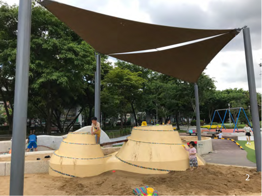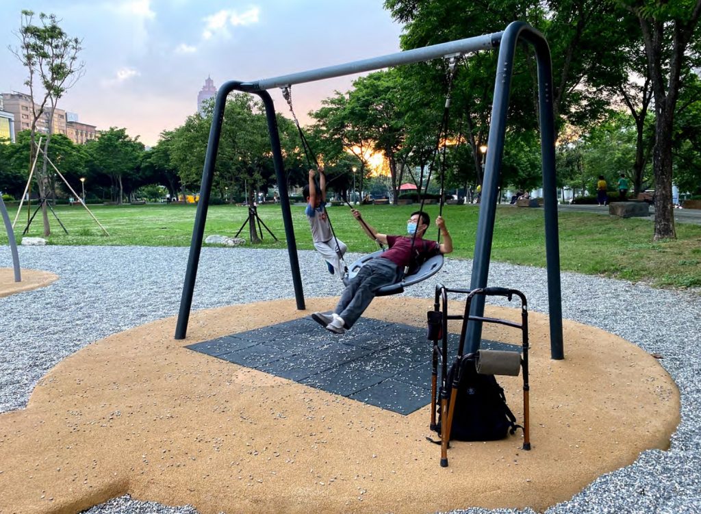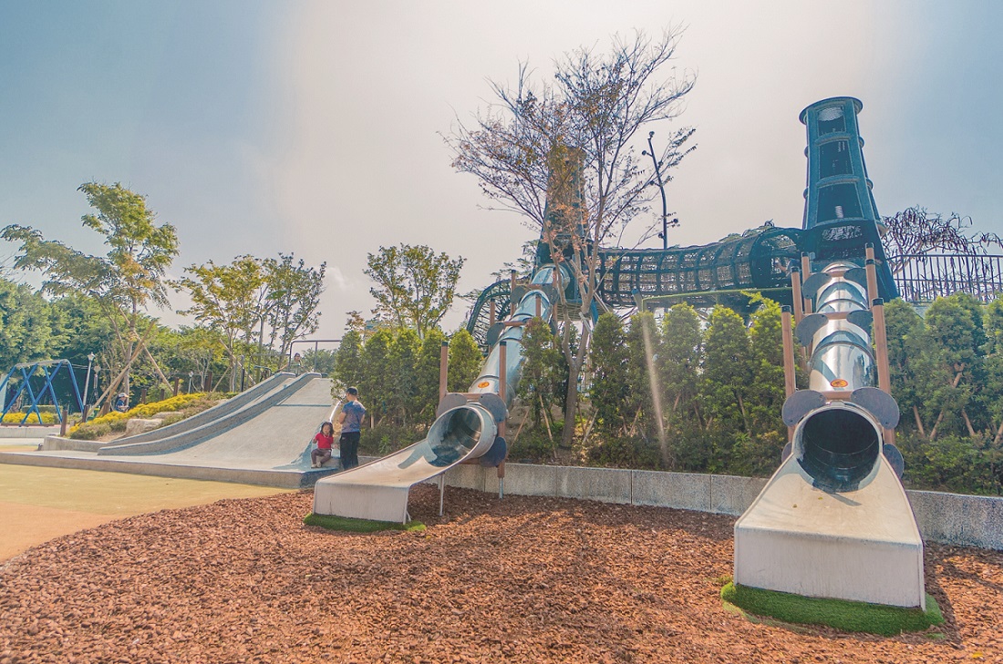 靠近華山文創園區的吃喝玩樂,交通也非常便利,除了漸漸長大可以作為自然遮蔭的植栽樹木之外,每一個施工細節都能讓人感受到為了孩子而堅持的質感,連遊戲場邊的高燈都有方向規劃和趣味巧思,到了夜晚還有地面照明,可以讓捨不得回家的孩子玩個徹底,而陪伴的親職照顧者在場邊,也有可以休息等待的桌椅。