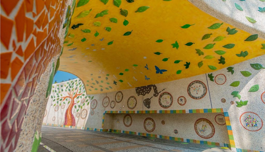 公園入口緬懷華山車站歷史的軌道隧道中,呈現了當初為所有孩子而誕生、由孩子實質參與 促成的過程,告示牌上也可以看到當時工作坊的照片。而象徵台北酒廠鐵路通過隧道的牆面上,鑲嵌了孩子在工作坊中的手作馬賽克瓷磚 拼貼畫圖案,為孩子們留下參與的印記。除了 將工作坊中所觀察到的孩子遊戲面貌、活動需 求和設計想法,盡可能打造出來,也融合了酒廠古蹟煙囪,讓它成為遊戲場的制高點。孩子在玩耍時,也能想到這一塊土地在歷史上曾經有什麼故事。對於兒童參與過程非常細致處理的梁瀚云面對如此貼近理想的兒童參與過程, 認為這是讓這裡成為全台親子朝聖必來之地的原因。