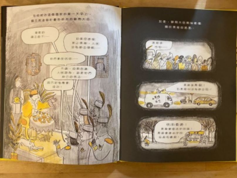 繪本《禁止黑暗的國王》,提到一個怕黑的小男孩,小男孩怕黑,而他是王子。怕黑小王子當上了國王,就開始對付黑暗,最後一一禁止黑暗!大臣們用了一些「方法」去幫助這個政策,例如,散播黑暗的謠言。