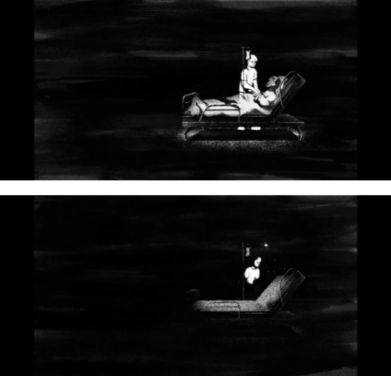 在《燈塔Lighthouse),有一個畫面,滂沱大雨下,青年想起爺爺臨終的一刻。跳動的心電圖,在黑暗的畫面停止,阿爺變成一隻小小螢火蟲飛走⋯