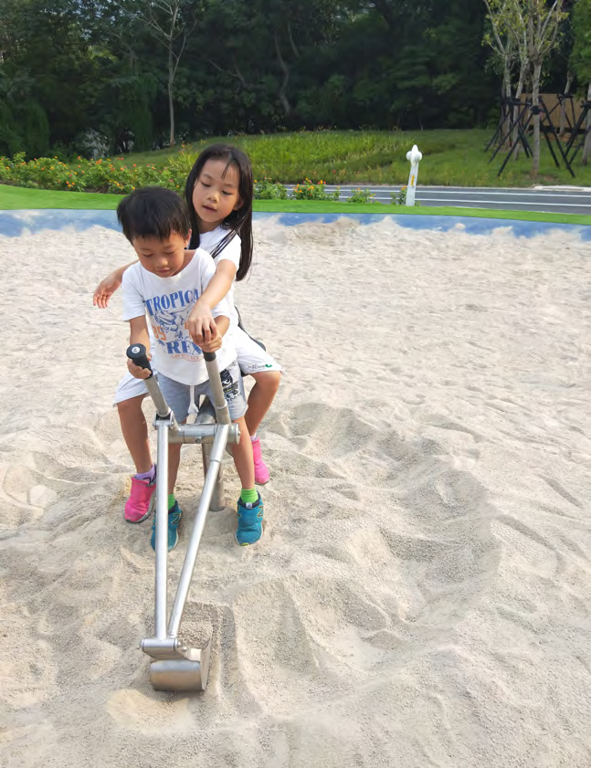 強調遊戲空間整體配色不再使用浮誇的五顏六色,除了烈陽下對於所有矢勇族群都較刺眼之外,低彩度和低明度的配色對於視覺能力較低的特殊需求兒童較不會造成視覺感官的疲勞; 減少環境的視覺刺激,對於廣泛性發展需要協助的孩子較為友善。並且,沒有狀況外的入口 意象或彩繪圖案不說,最讓人驚豔的是利用無縫軟鋪顏色畫出遊具四周安全區域,舉例來說:在旋轉盤四周,畫了一圈大圓,讓孩子自然而然知道要站在圓外才安全,是很優化的使用者經驗。