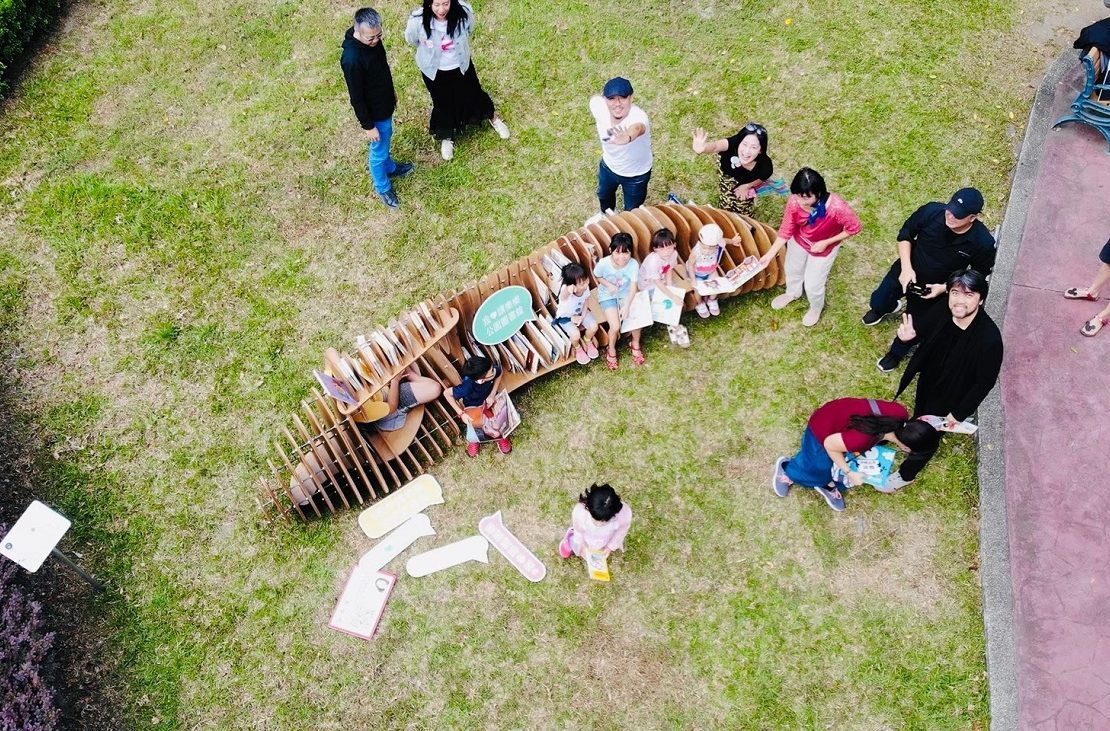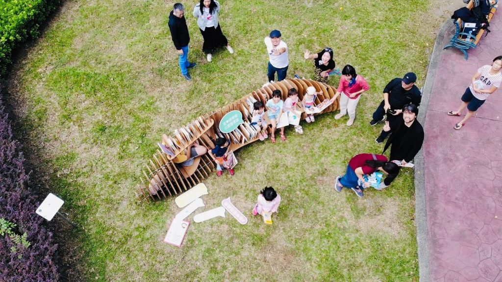 開始有孩子,拿起繪本在公園的草地上開始閱讀;阿公阿罵也把家裡的書帶過去放;在一旁陪伴孩子玩樂家長,也可以拿本書喘口氣⋯⋯,這些案例很明確希望把閱讀的元素加入公園的場域,試圖從硬體改造,融合些許的「軟」想像,開始擾動公園的角色。