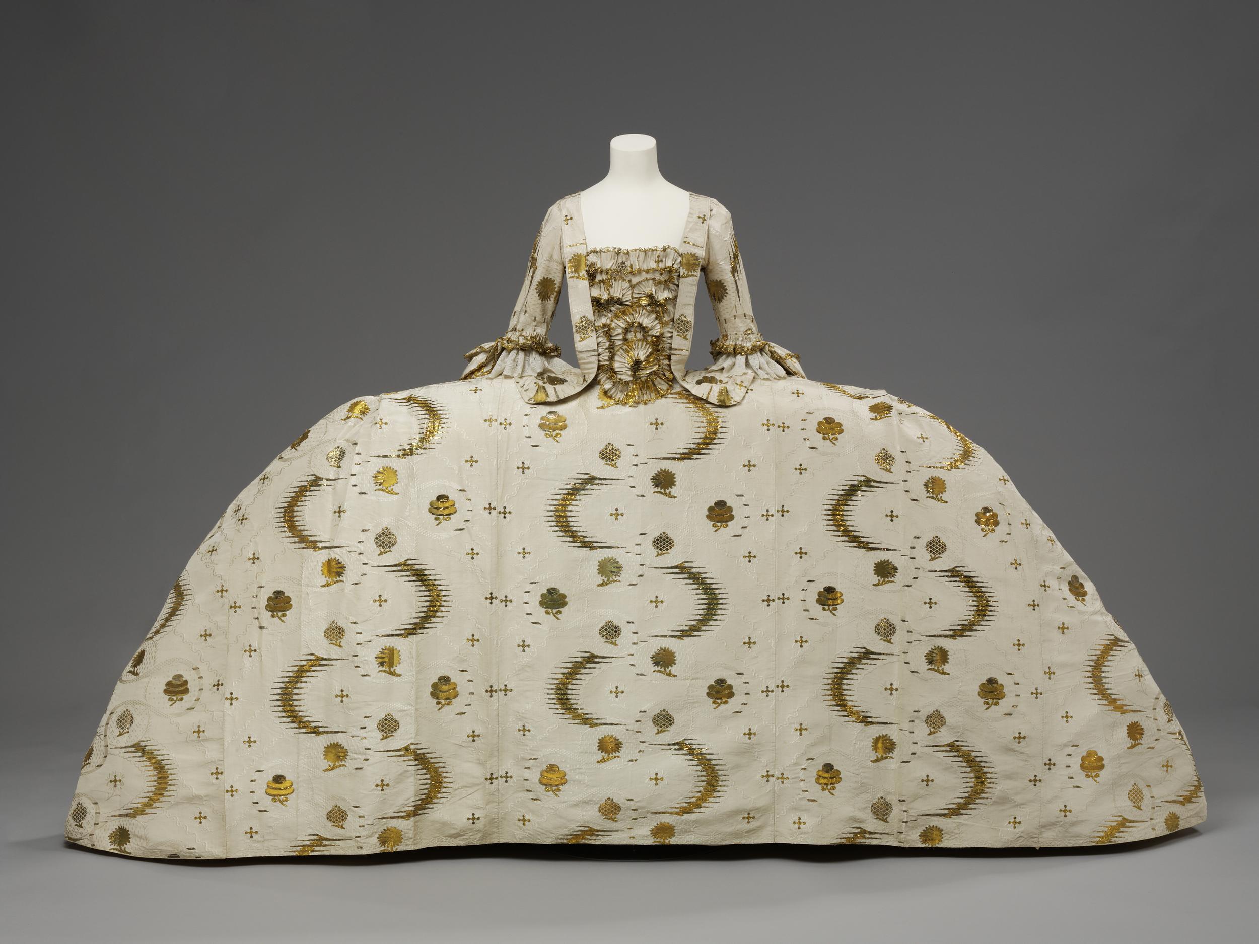 一起來欣賞幾件博物館裡收藏的服飾吧!眼前這個下襬超級寬、好像可以裝下五個屁股的米白色洋裝,就是我們今天要發揮想像力試穿的衣服。這件洋裝的上半身和袖口,有著花瓣一般的皺褶,下擺則用金色和銀色的絲線,縫出花朵、小樹、小草、星星等圖案,看起來非常端莊典雅。如果您是一個不擅長社交的人,在聚會時穿著這件洋裝,或許就可以避開人群,因為只要一轉身裙擺很可能就會撞到人!這件洋裝是大約300年前英國貴族女性流行的服飾,不過在不到50年的時間裡,這款洋裝就已經退流行,只有貴族女性在進入宮廷晉見王室時才會穿。能夠穿著這件洋裝其實很不容易喔!那些貴族小姐們需要有技巧地擺動裙襬,才能順利地穿過走廊、爬上馬車,同時保持著優雅。