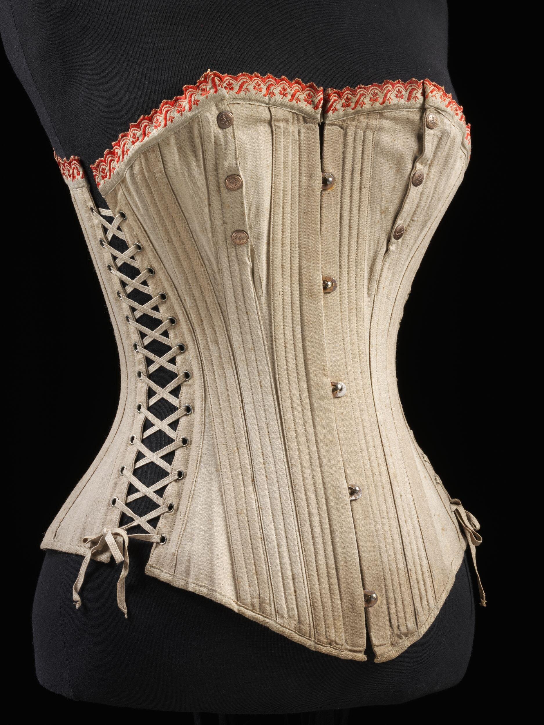 讓我們繼續參觀,眼前這件布料少少的女性束身內衣,竟然也是博物館的收藏品!您注意到了嗎?這件上緣有著紅色蕾絲的內衣,除了正面有一直排的扣子之外,兩邊胸部還各縫有三顆扣子。原來,這並不是普通的束身內衣,而是100多年前英國或德國專為孕婦設計的束身內衣,而胸部前那三顆扣子和腰部側邊的綁帶,正是為了讓孕婦即使胸部和肚子變大了,也能夠繼續穿著束身內衣來維持苗條身材的設計。看來不管是哪個年代的女性,都有著想當個美美辣媽的夢想啊!