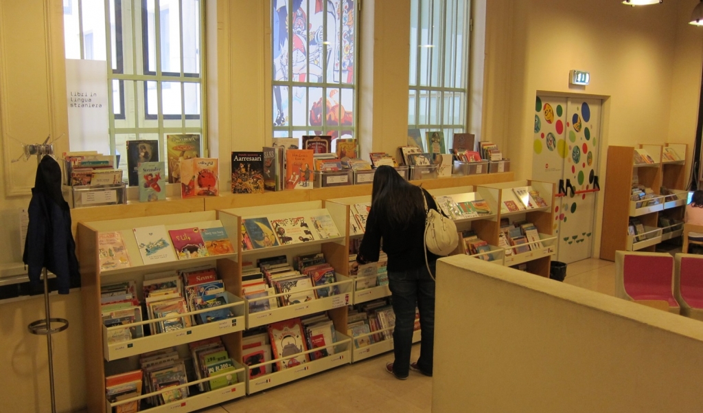 地下第一個房間,放的是各國語言的繪本,很多來參與童書展的廠商,在書展結束後,會將書籍贈與Biblioteca Salaborsa,在這個房間內的繪本是按照語言分類,在書櫃的前方貼著國旗與語言名稱。