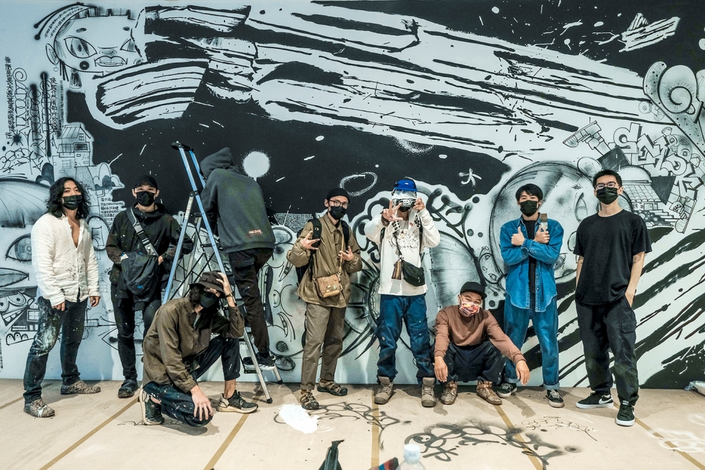 除了黑白牆面的現地創作之外,還有九位藝術家個別的作品展示。(圖片來源:朱銘美術館) 有各自特色的藝術家以塗鴉接圖的方式,激盪出多元的創意。(圖片來源:朱銘美術館)