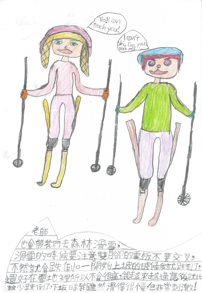 老師也會帶我們去森林滑雪,滑雪的時候要注意雙腳的雪板不要交叉,不然就會跌倒。一開始上坡的時候我就跌倒了,還好在雪地裡所以不會很痛,我越來越適應後就比較少跌倒了,下坡時我雖然滑得很慢,但非常刺激!