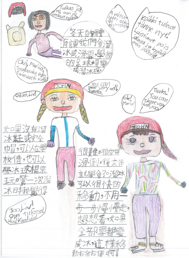 冬天的體育課我們會溜冰或滑雪,學校的足球場變成溜冰場,如果沒有溜冰鞋或安全帽,可以在學校借,也可以帶冰球棍來玩! 芬蘭老師經常在課堂上融入各種遊戲,讓孩子透過遊戲來學習,不但可以成功引起孩子的學習動機,提高課堂專注力,更能讓學習更有成效。