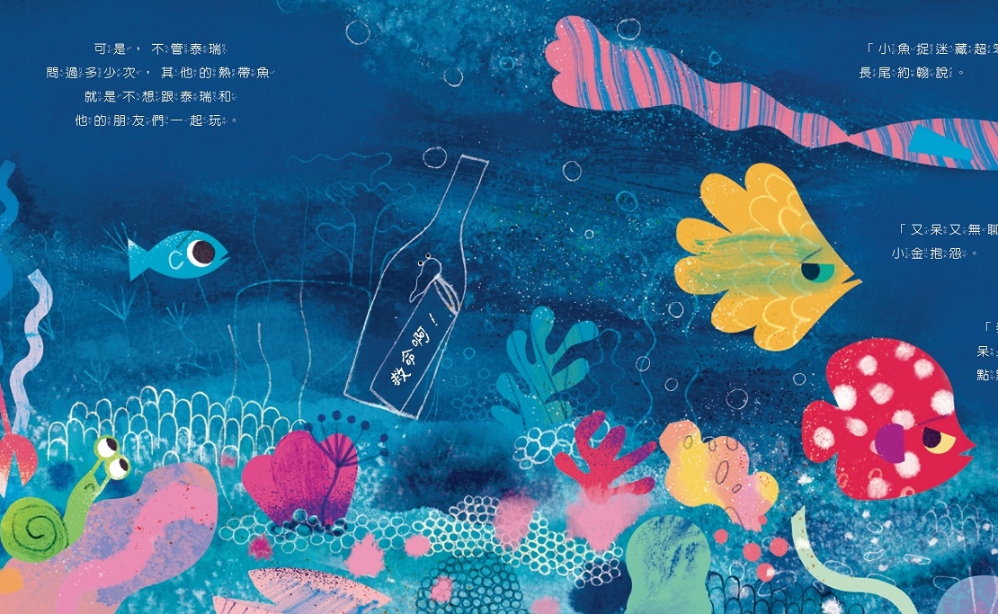 臺灣四面環海,是一個典型的海島國家,擁有豐富的海洋資源。但對大多數人來說,能親近海洋的機會並不多。這此繪本以色彩繽紛的海底世界為封面,吸引我們想要翻書。果然,創作者沒有讓我們失望,在閱讀過程中,我們彷彿跟著小魚泰瑞,一起徜徉在美麗的海底世界。