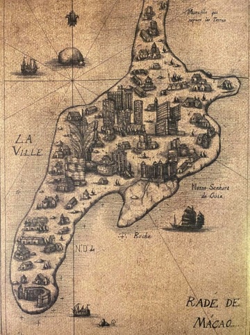 1607年出版的《東印度群島》(Indium Orientalem)裡的阿媽港圖(AMACAO),裡面的圖像風格非常不「地理」,像繪本地圖,畫出了許多市井生活:在一個週邊島嶼如珠的大海上,有西洋船揚帆而來。靠近陸地的地方,幾艘獨木舟浮沈。「眾多」的商船,進到十字門海口就收帆,準備停靠在港口,交換中西貨物。這裡一直被認為是西方貨物與文化進來東方的一個重要航道,船港旁邊就是市場:肉販攤檔、雞鴨亂跑⋯⋯還有在建築之間「街道」坐轎子的貴人、騎馬撐傘行走的人、肩負扁擔者、耕種的農夫。