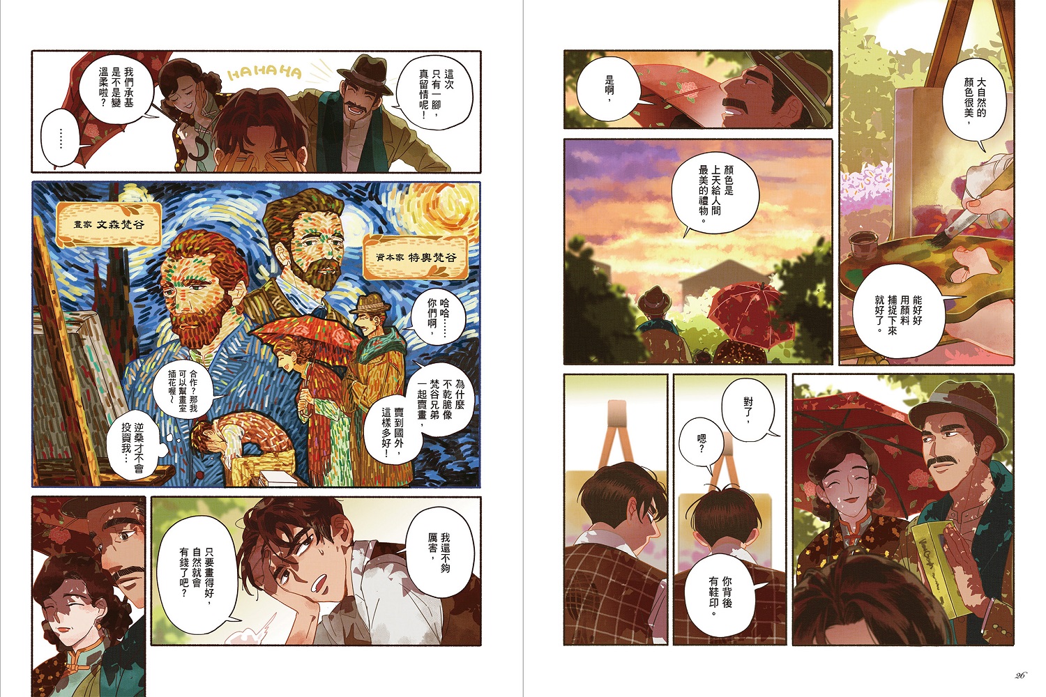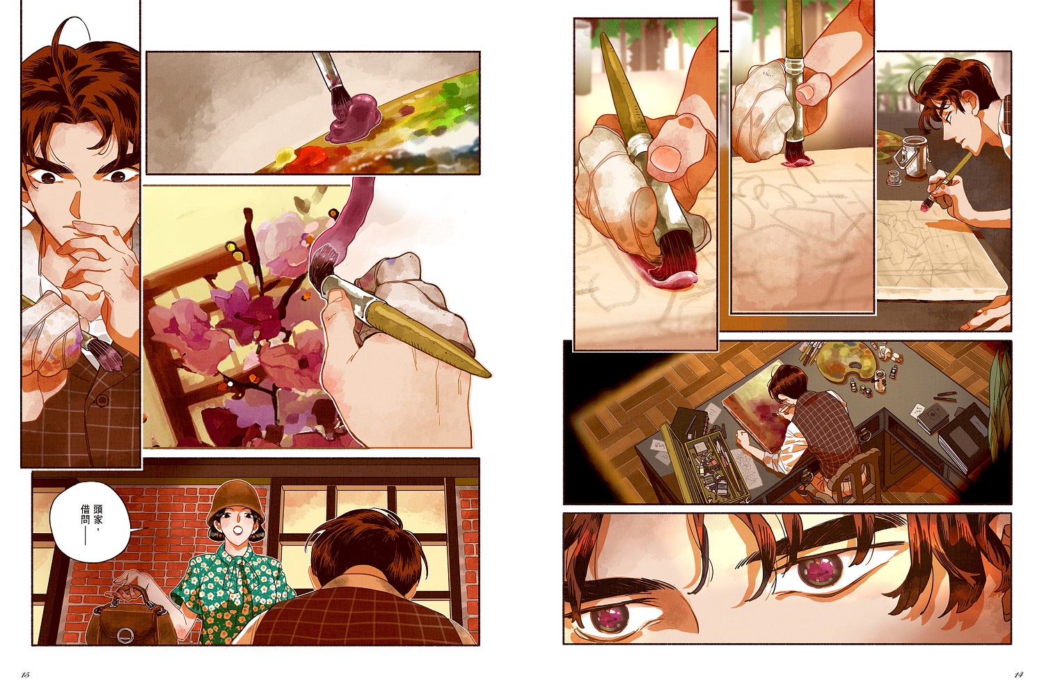 只是,昔日的楊佐三郎是在花園裡迎著下午的光線作畫,但HOM多數時候是窩在家裡畫畫,因為整個過程都在趕稿,「有啦,我有在外面畫畫,不過是在高鐵上趕稿……(淚)我只能用腦袋與作品來致敬,行動上完全無法致敬。」HOM也確實非常強調光線,《無價之畫》的第一頁便是光線非常美麗的跨頁,畫面上的楊佐三郎執著調色盤,自信地看向漫畫家望過來的視角。