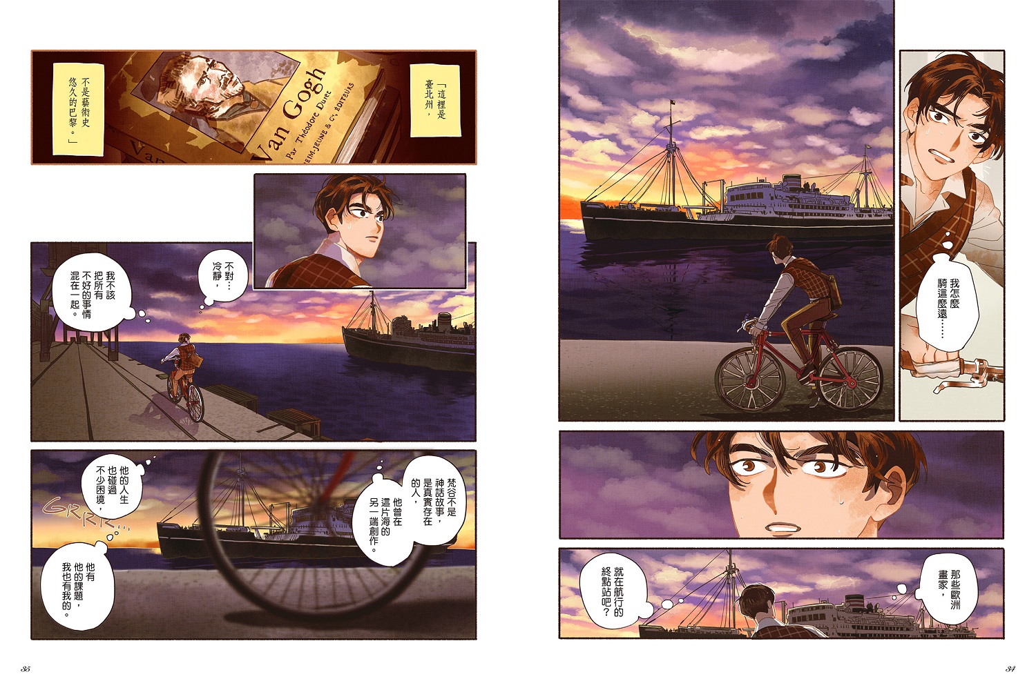 接下來的第35頁,騎著腳踏車的楊佐三郎來到基隆港邊,HOM的視角落在單車的車輪。從單車車輪看出去,是一艘巨大的郵輪,正準備航向世界,這也是她刻意製造的類比,「船在前進,腳踏車也在前進。我刻意把輪子放在前側,跟遠方的船比起來,腳踏車很渺小。感覺我們在很小的地方,嚮往很厲害的遠方,就像創作者看見很厲害的作品,忍不住會想,『一樣在畫畫,一樣在前行,他們為什麼這麼強大?』」