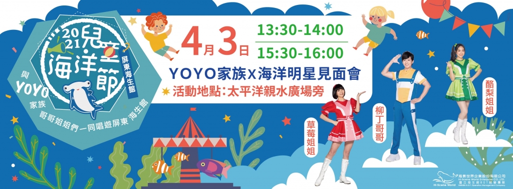 兒童界的天王天后-YOYO家族,將與大家相約4月3日在海生館的太平洋親水廣場旁一起唱跳!HIGH翻海底世界!除了大家耳熟能詳的親子台哥哥姐姐及經典組曲外,還有萌度爆表的海洋生物明星一同歡度豐富有趣的兒童海洋節。
