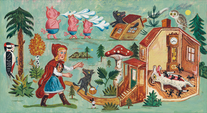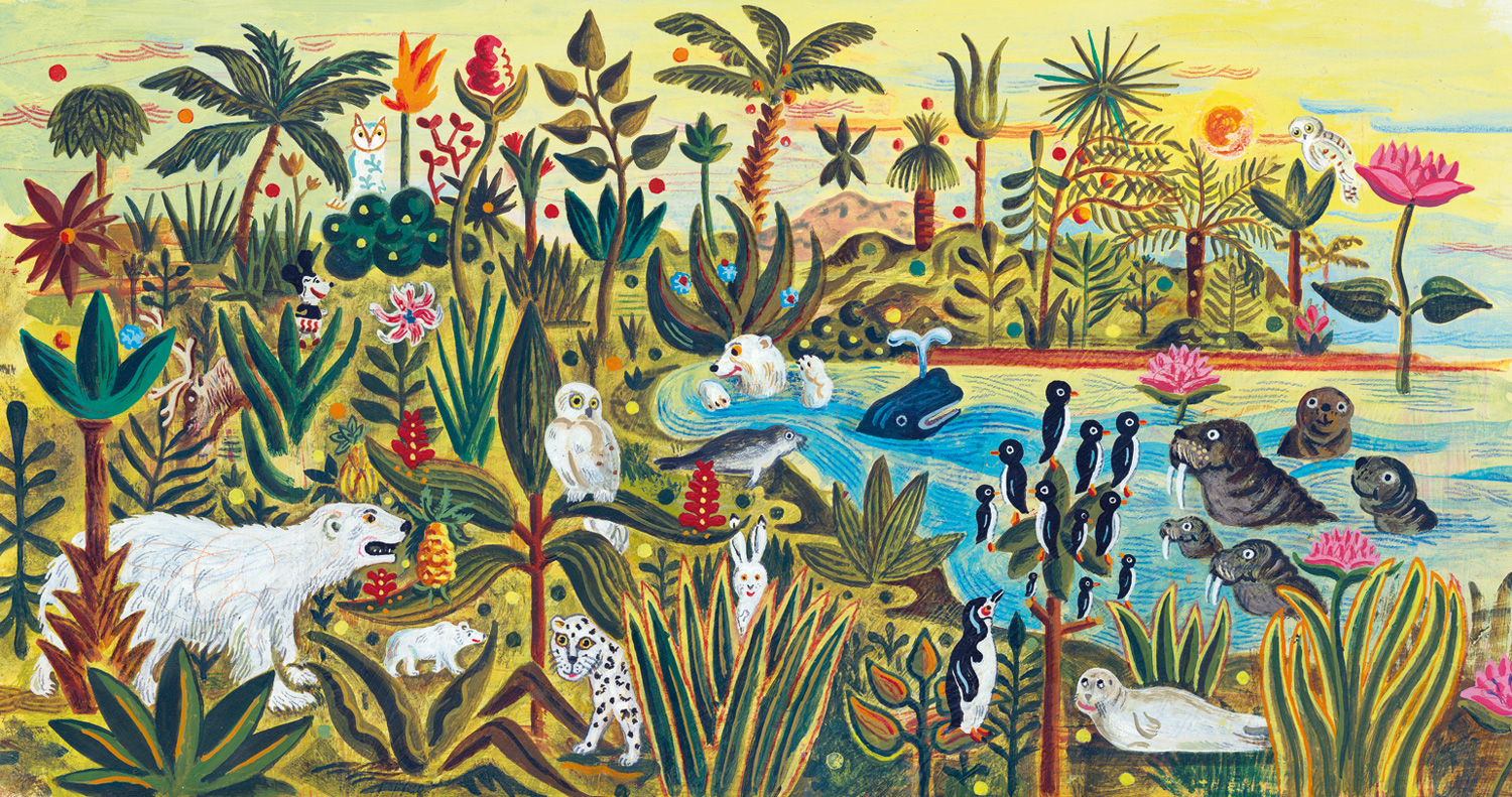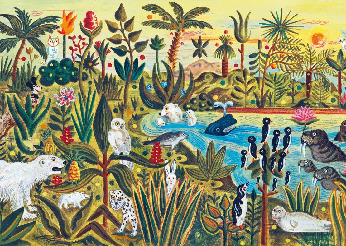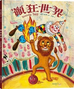 阿塔克的《顛狂世界》,正延續了兒童文學中並不算悠久的超現實路線。這是一本大膽的圖畫書,為我們熟知的現實打造了戲劇性的逆轉。在其中一頁,我們看到北極熊和企鵝身處熱帶雨林;在另一頁,我們見到守衛被鎖在籠中,應作展演用的獅子則杵在籠外,睜大雙眼望向讀者。獅子的表情似乎有點難解,好似迷失了自己,困惑於為何牠的表演無法開始?這頭獅子也似以無辜的情態,把守衛關在籠裡,打破第四面牆並望向讀者問道:「你在看我所看的東西嗎?你在想我所想的事情嗎?」書中的這一幕,當然不是我們所熟悉的階級和生態,在現實生活中,我們都曾看過動物園或馬戲團如何運作:應由一人手執鞭子,獅子則蹲伏在旁。