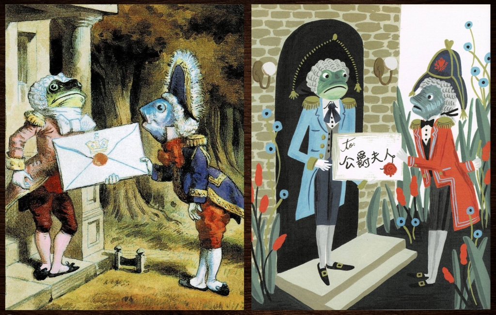 欣賞了不同插畫家的詮釋,再仔細看一遍魚臉僕人和蛙臉僕人,是不是逗趣的令你想要大笑呢?!原來,走進故事裡的讀者真的很容易陷入瘋狂。這似乎恰恰符合柴郡貓的瘋子言論,來這裡的都是瘋子,或者變成瘋子?!