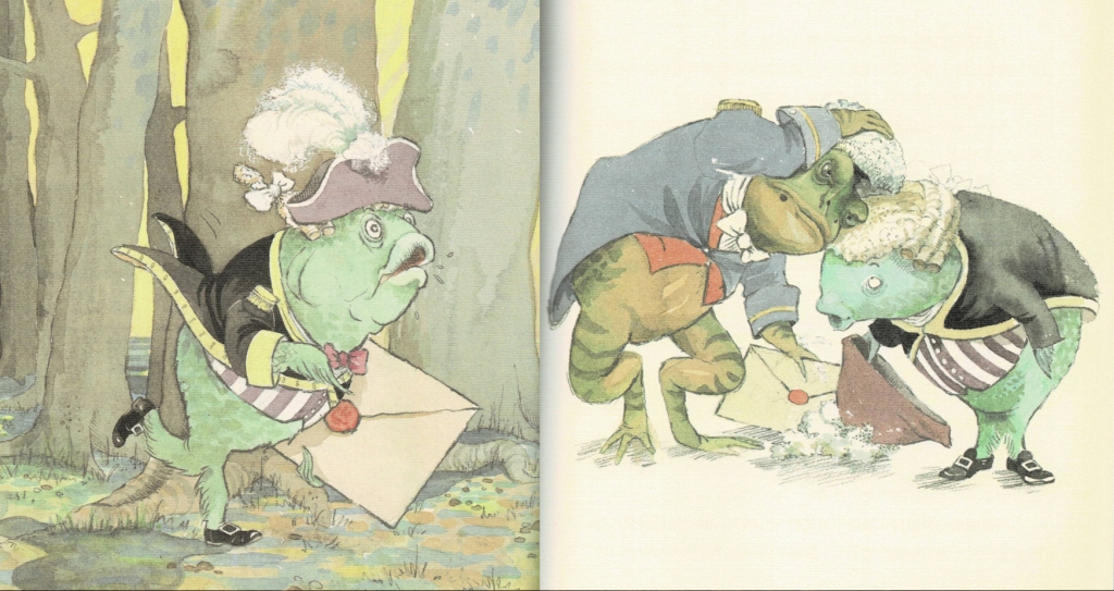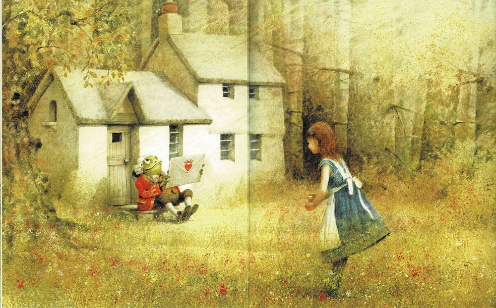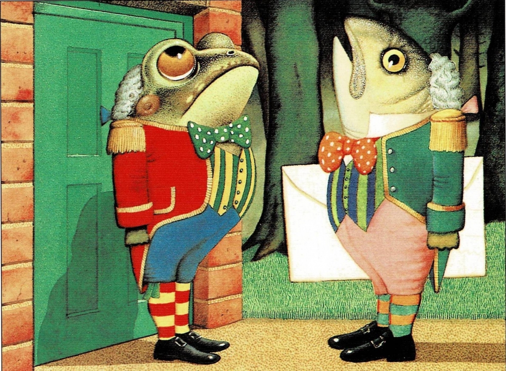 在羅伯.英潘筆下,蛙臉僕人手裡拿著這封信,顯示魚臉僕人已送信完成離開。滿版的畫面與細緻的筆觸,增添奇幻氛圍的重量(圖片12)。