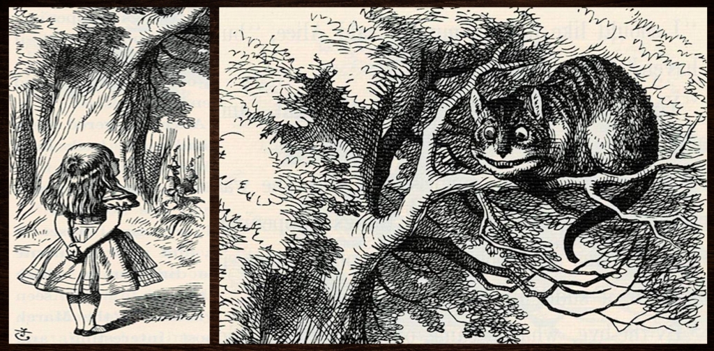 圖片4|約翰.坦尼爾(John Tenniel)繪。愛麗絲與柴郡貓。