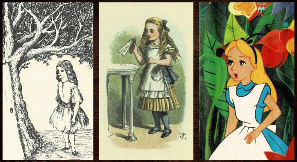 圖片6|《愛麗絲夢遊奇境》裡的愛麗絲形象,分別為卡洛爾本人所繪(圖左一),約翰.坦尼爾繪製的彩圖版(圖左二),迪士尼動畫版(圖右)。