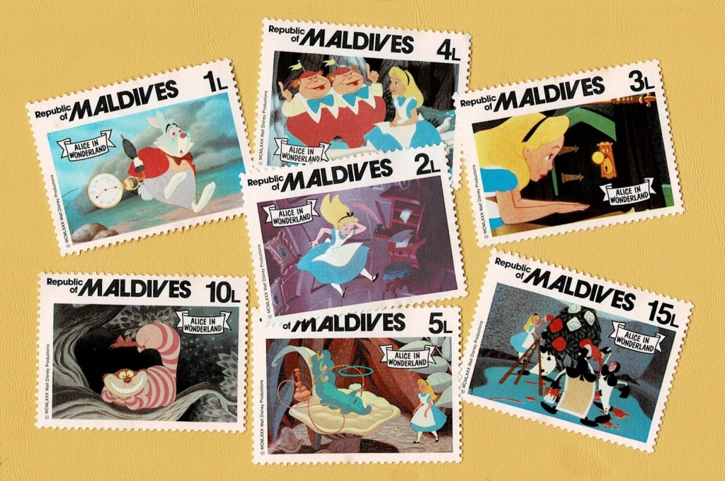 馬爾地夫(MALDIVES)在1980年曾發行迪士尼動畫《愛麗絲夢遊仙境》主題郵票,生動地呈現故事中趕時間的兔子、墜入洞裡的愛麗絲、變大變小的愛麗絲、雙胞胎叮噹咚和叮噹叮、抽水煙的毛毛蟲、柴郡貓、為玫瑰上色的撲克牌園丁等動畫裡主要場景和角色(圖片7)。