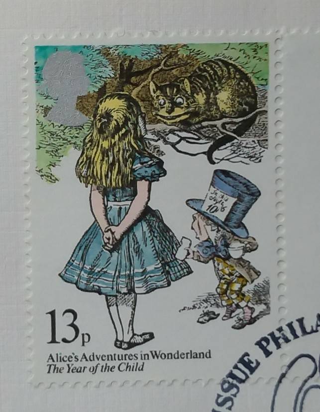英國為了配合國際兒童年,在1979年07月11日發行四枚童話郵票,其中之一便是《愛麗絲漫遊奇境》。郵票上的圖案是插畫家約翰.坦尼爾所繪的愛麗絲與樹上的柴郡貓對話的經典畫面,另外還有知名主角瘋帽匠(圖片8)。