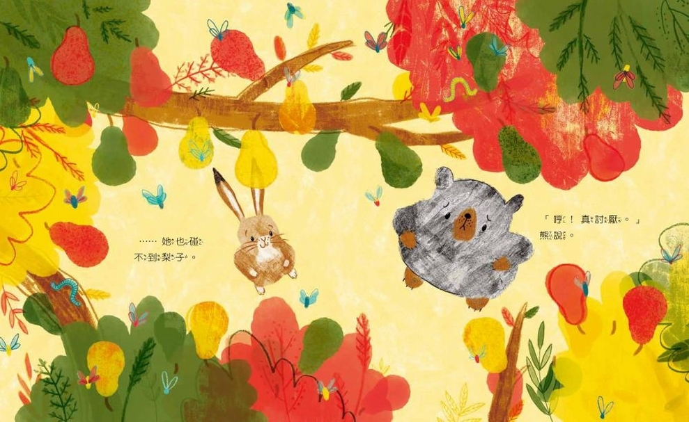 一顆梨子樹結實累累,野兔想摘卻搆不著,熊也是。他們拿了椅子幫忙,但是野兔想拿了兩張椅子,熊卻只分到一張,他大喊不公平!野兔想只好留給自己一張椅子,但是這一回,熊搆著了樹,摘到梨子,野兔想卻搆不著,這算哪門子公平?這時,來了一隻甲蟲說:這樣不公平!