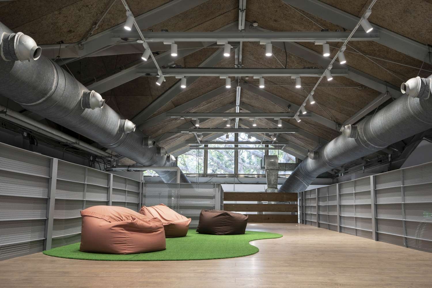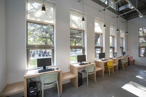 新竹「紅磚玻璃屋」圖書館由原先樓中樓改為落地式大階梯座位區,大片落地窗讓館內空間連結到周邊綠地上,空間感更開闊、明亮,宛如有了新生命。(圖片取自新竹市文化局)
