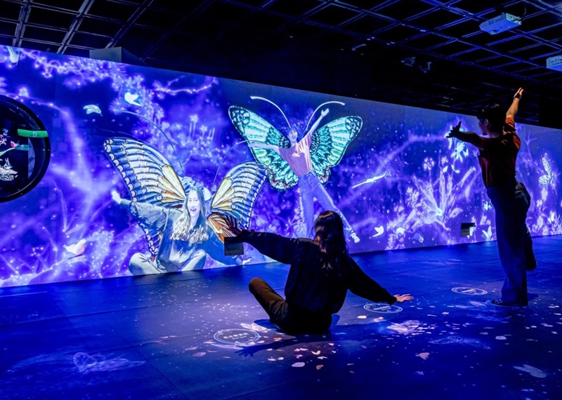 走到展覽入口,你會看到以宋徽宗〈詩帖〉中「舞蝶香徑」為意象,透過動態投影營造舞蝶光影情境,蔓延一條貫穿展覽空間且充滿舞蝶詩意幻境的互動廊道,帶領觀眾跟著蝴蝶蹤跡穿梭「寰宇歷遊」、「幻象古水族」、「富春印象」、「造夢星球」四大展區,探索故宮動漫、數位典藏、新媒體、明日博物館,感受一場21世紀的魔幻山水歷險之旅。