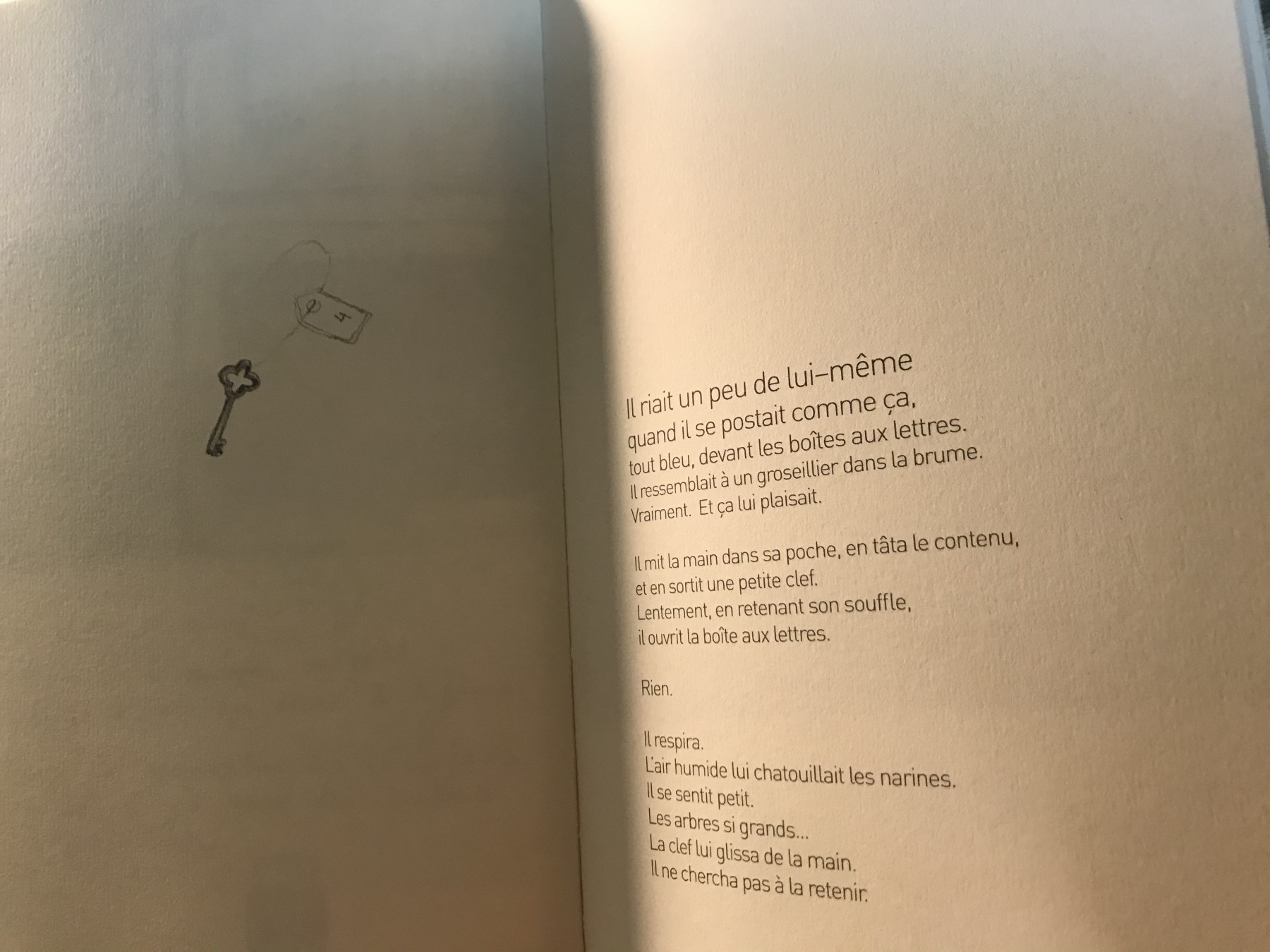 當文字敘述亨利往橡樹林的路上走去,開啟郵箱取信時,左邊篇幅是一片橡樹的葉子。當亨利打開郵箱的那一瞬,畫面留著一把郵箱的鑰匙。而就在這幾頁圖文之前,作者給了我們一位趴睡在草地上的亨利。一個轉折之處。突然之間,樹葉或鑰匙,走路與取信,所有物件和行動似乎意有所指了起來。我們知道,文字下已長出另外一個故事。