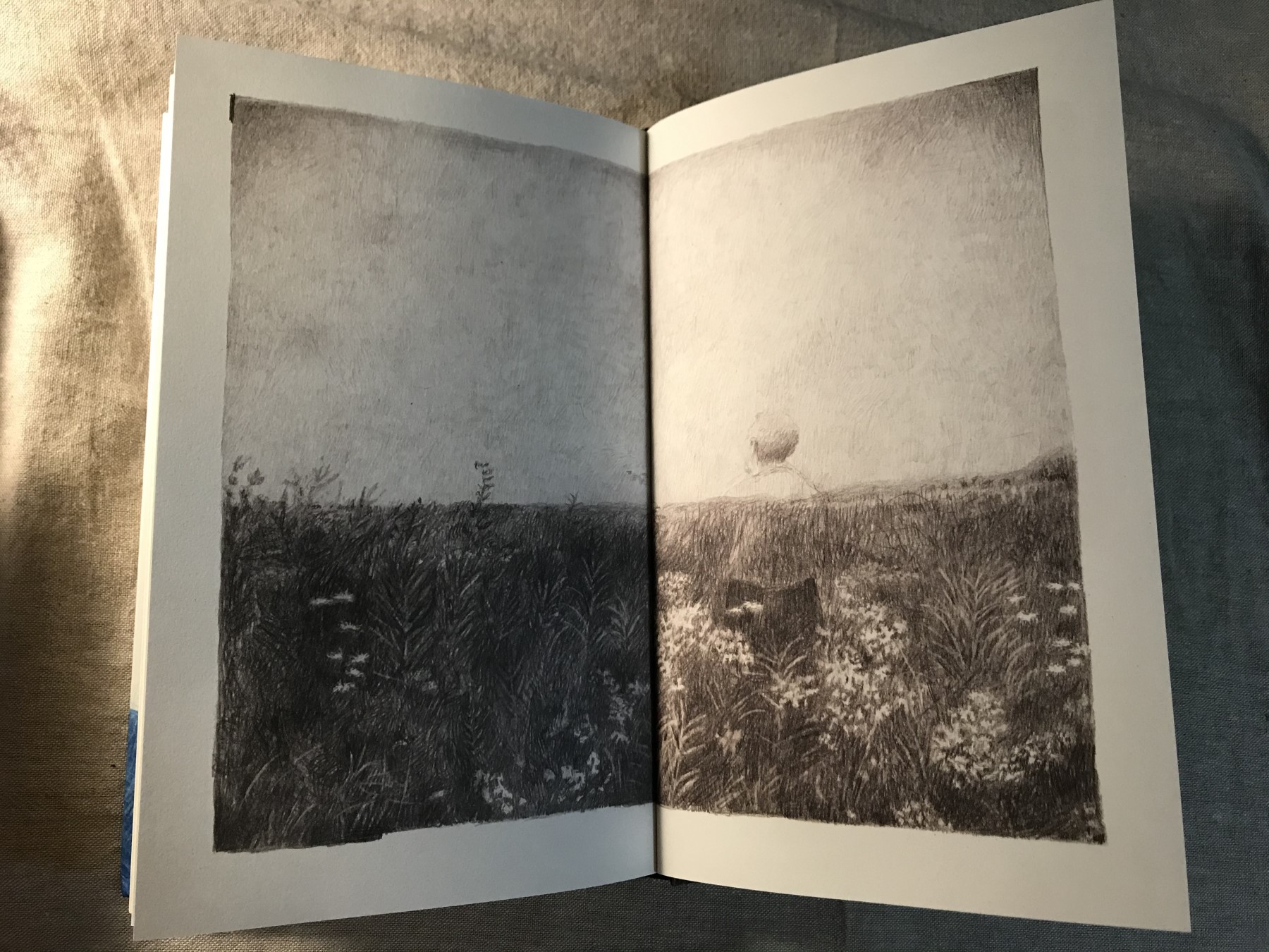 反之亦然,當文字描述亨利坐在房子前的長凳,閉上了眼睛。下一頁,我們看見一位男人的身影融於一片景色中……。