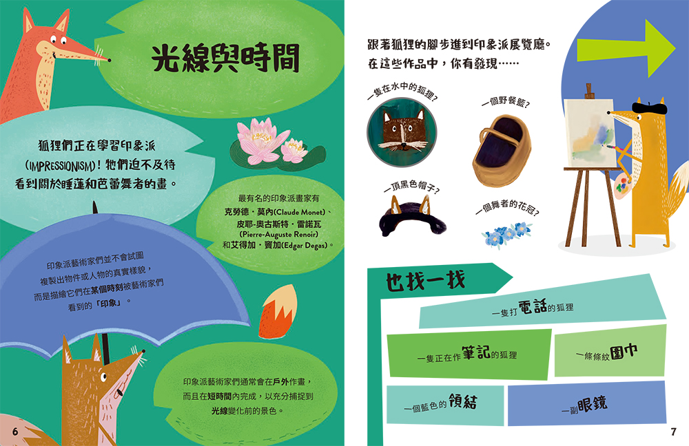 翻譯本書時最讓我驚豔的,是作者對於每一個藝術運動、藝術流派所下的標題,可以說是簡潔、具體又精準的「關鍵字」:我們從印象派作品中,去感受畫面裡的光線與時間;從表現主義作品中,去目擊想法和感受如何被表現;從立體派作品中,去學到以不同角度和形狀來觀看事物;從歐普藝術作品中,驚嘆怎麼樣的詭計和線條動態,能挑戰我們的視覺經驗。現代藝術家們藉由作品展現他們對客觀世界的感受,這一趟美術館之旅,豐富了兒童的藝術知識與觀看體驗。