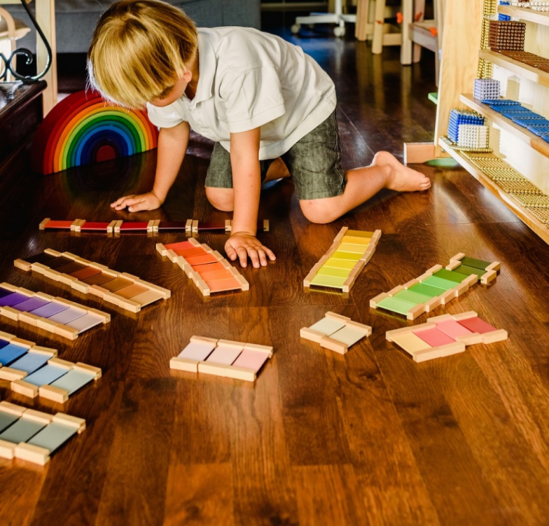 這個「以孩子為中心」的教學理念,在教室的布置中,給予孩子各式各樣多功能又有趣的素材,每一樣都是在適當高度的架上能輕易取得;這些小物件沒有特定的用法,給孩子無限的創意空間,鼓勵主動探索,支持孩子自訂目標。