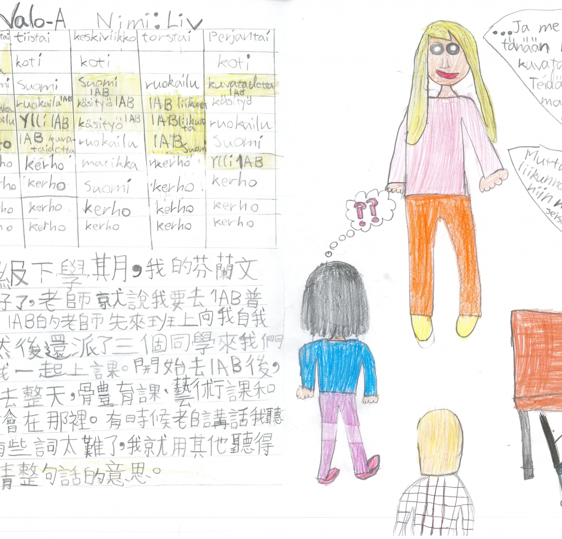 一年級下學期,我的芬蘭文比較好了,老師就說我要去1AB普通班,1AB的老師先來班上向我自我介紹,然後還派了三個同學來我們班和我一起上課。