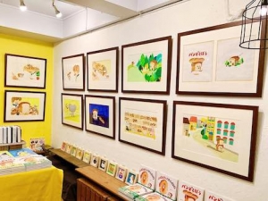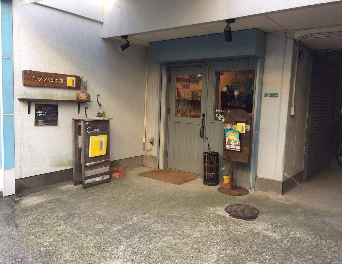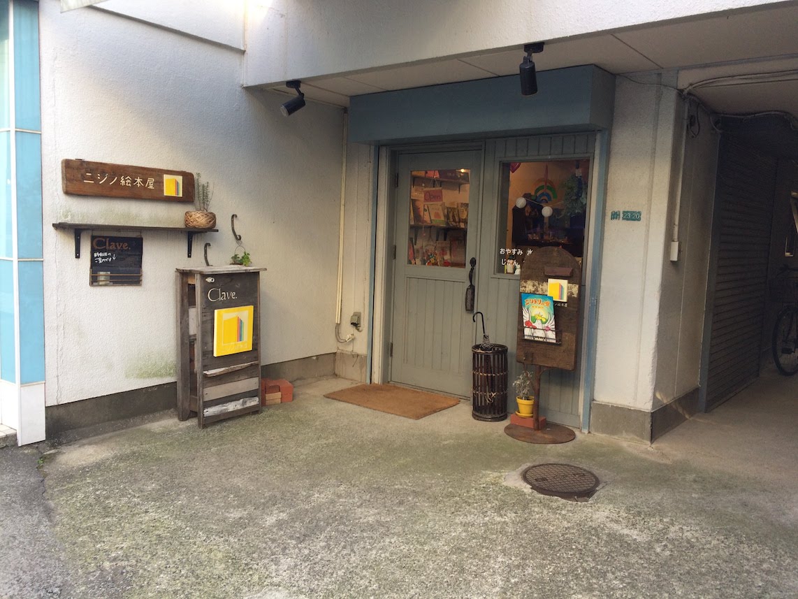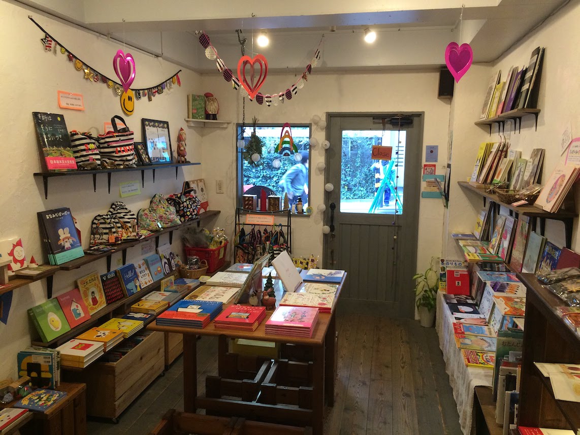 從都立大學站南口出來,沿著坡道往上走一小段,就可以看到「ニジノ絵本屋」(彩虹繪本屋)。相對開闊的門口,店內為狹長的空間,櫃臺在最深處。跟多數的獨立繪本書店一樣,除了繪本之外,還會陳列許多繪本週邊雜貨,甚至連牆上都掛滿了繪本原畫。