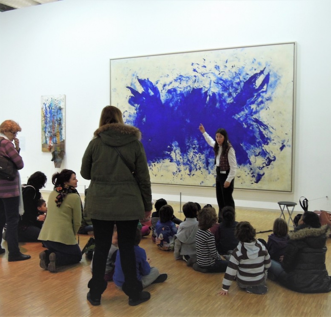 直到現在我還沒法忘記這個畫面:那些抽象的藍色系,彷彿隨著不同節拍的海浪由天際蔓延開來…不僅牢牢地抓住了孩子的眼神,也拍打在我心裡…不知過了多久琴聲停止,在一片靜默後,老師才起身說話,接著孩子們以自己獨有的純真,踴躍也認真地跟老師分享他們的想法。(謝謝身旁一個好心的法國人用英文告訴我孩子的回應,印象最深的是有個孩子說畫裡有一群快樂的魚朋友們在開party )