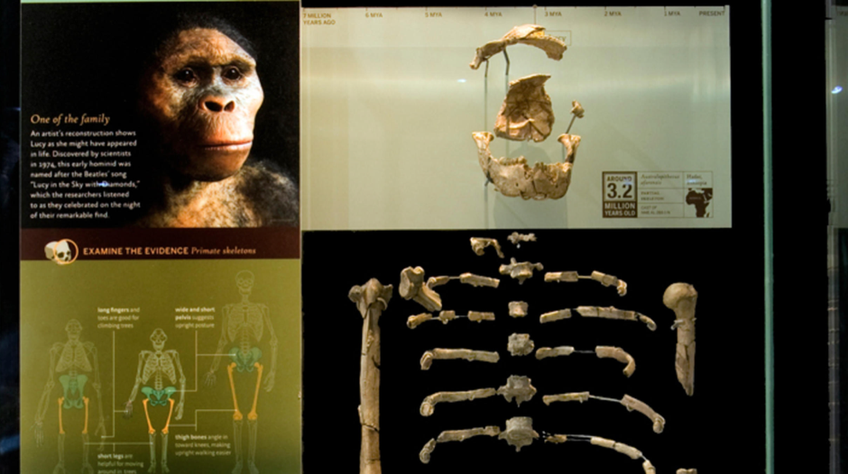 觀察完各式各樣的動物之後,讓我們繼續下一個任務,請前往二、三樓的人類起源與文化展區。在這些展區裡,不僅能夠看到不同文化的雕像與工藝品,包括復活節島上的摩艾石像、阿茲特克文明的太陽石,和中國古代婚禮的轎子等等,還能夠了解七百萬年來,我們的祖先從猿人進化為現代人類的過程。其中,最不能錯過的就是名為「露西」的人骨化石。眼前這個由米白色骨頭拼出,身高大約120公分的人形,據說就是現代智人最早的祖先——南方猿人。你可以想像當時的考古探險家在非洲發現這批完整的人骨時有多麽驚訝,因為這位生活在200到400萬年前的「露西」,很可能就是解開人類最早祖先謎團的關鍵人物!更好玩的是,「露西」名字的由來,竟然是因為當時的考古探險家在找到他時,正好聽著披頭四的歌曲〈Lucy In the Sky with Diamond〉。