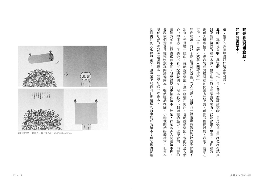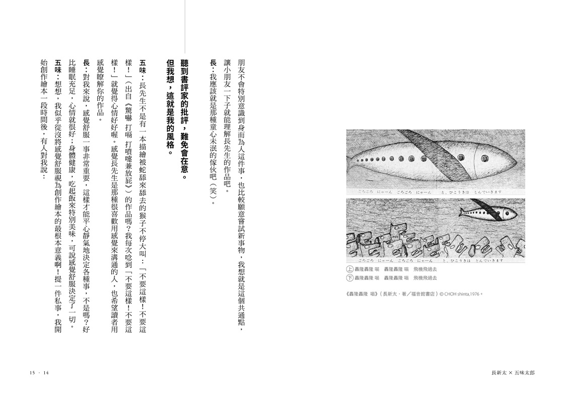 這個特別的專題企畫在落實時,給了與談人隨興發揮、引申的空間,從文字紀錄可明顯看出他們關切的所在各自不同,循著各家的思路,也不難從他們的獨特觀點而獲得啟發,比如: 五味太郎提到作品被人批評「沒有內容」,長太新回應自己的也是,不少讀者批評他創作的《轟隆轟隆 喵》毫無意義,甚至投書到出版社去反映。