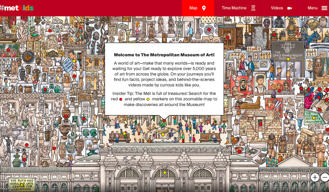紐約大都會藝術博物館是世界上最大、參觀人數最多的藝術博物館之一,除了開放超過37萬5千張藝術作品之圖片供公眾瀏覽、下載、使用,也提供MetKids資源,此網站專為兒童所設計,不僅可以藉由精美、細緻的地圖,線上探索大都會藝術博物館的館體及展出物件,也能透過「時光機(Time Machine)」設定時期、地理位置及主題,開啟一趟認識展品的旅程。網站互動式之設計與活潑的插圖皆使人目不轉睛、愛不釋手!