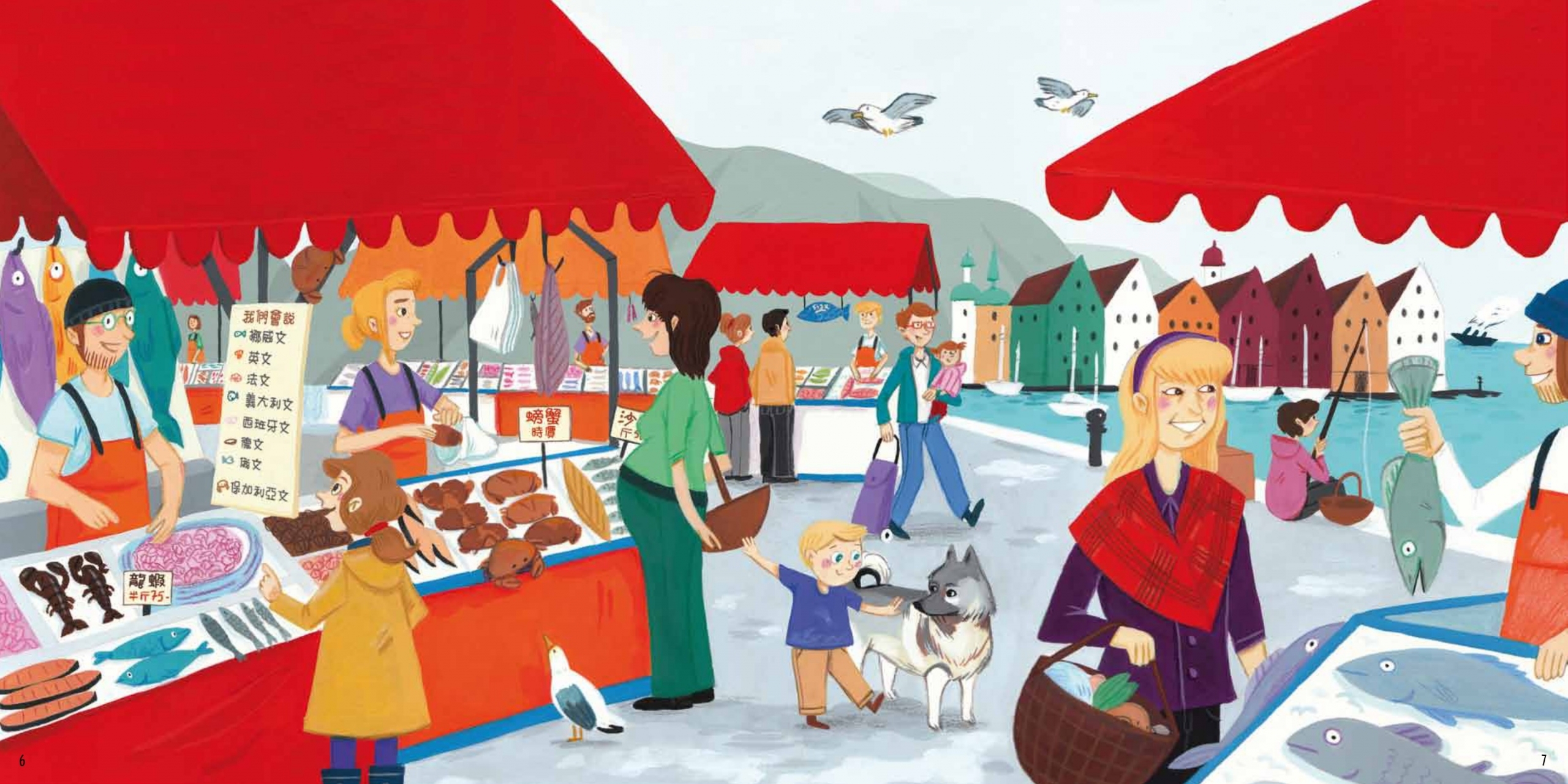 挪威峽灣的卑爾根Bergen,張開雙手歡迎大家來到北國,五顏六色的木屋躺在山腳下,海面上映照出美麗的倒影。房子對面的碼頭就是魚市場。當你愉快的走近海鮮攤位,你想要活跳跳的蝦子?還是排成列的鮭魚?所有的海鮮應有盡有。這裡的人都不會暈船,個個都是捕魚高手呢!