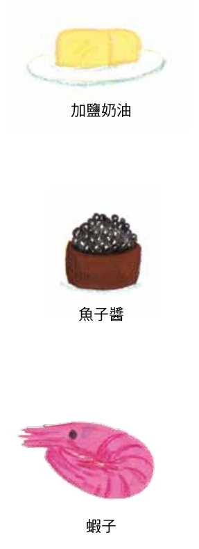 選擇你想要放在麵包上的材料:例如半片燻鮭魚、燻鱒魚、魚子醬、鮭魚卵、蝦……,通通都可以。折一小段香菜,擺在放上材料的麵包上,並在燻鮭魚、魚子醬或燻鱒魚上頭擠幾滴檸檬汁。