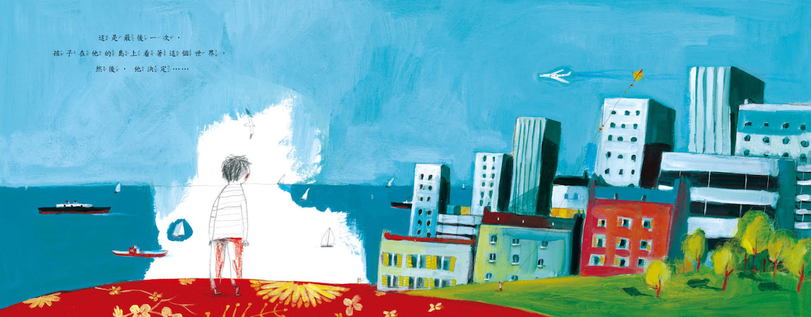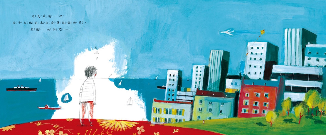 一個小孩從他的島上看著世界,他看見戰爭、飢荒、海洋污染、人們不懂愛與分享…他看見了世界的美麗,也看見世界的不完美;他靜靜的觀察,並想像該怎麼做才能讓世界變得更好。