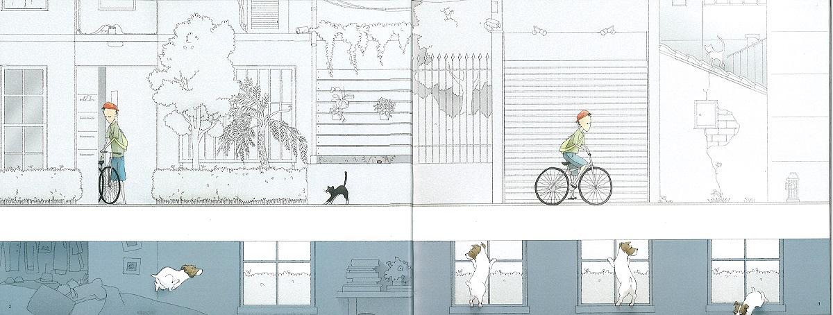 已有歸宿的狗,在家人陸續出門之後,獨自在家時都在做什麼呢?家中有狗的人,多少有過類似的疑問和好奇吧?孫心瑜獲信誼幼兒文學獎的作品《午後》,是一本無字繪本,書中多數頁面皆固定切分為上下兩段,上面四分之三的畫面是主角騎單車出門漫遊,下面四分之一則是單獨在家的狗兒。對照著看,非常有意思。