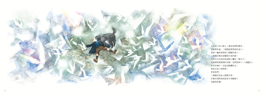 如果將這本書和《城市的狗》放在一起讀,《城市的狗》是人類拯救流浪狗,《男孩與三條腿》則是流浪狗拯救了人類,而且還是一隻少了一條腿的流浪狗。「三條腿」的活力和陪伴,讓心理層面不斷墜落的少年得到溫柔的承接。此書主角的處境與心境百轉千迴,篇幅有限的繪本很難做到這一點,也是此書特別的亮點。
